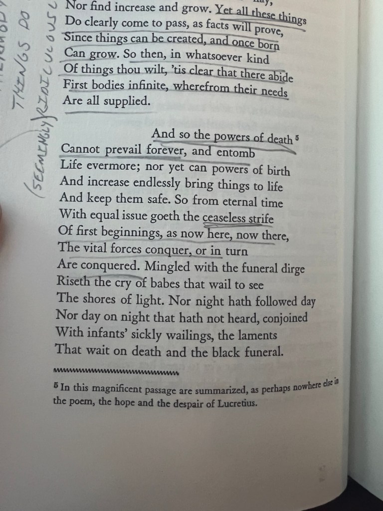 First thing – Lucretius is unbelievable prescient about some “modern physics” principles and ideas. The preceding paragraph, Lucretius is semi-concluding an exposition on what sounds like atoms, molecules and so forth.